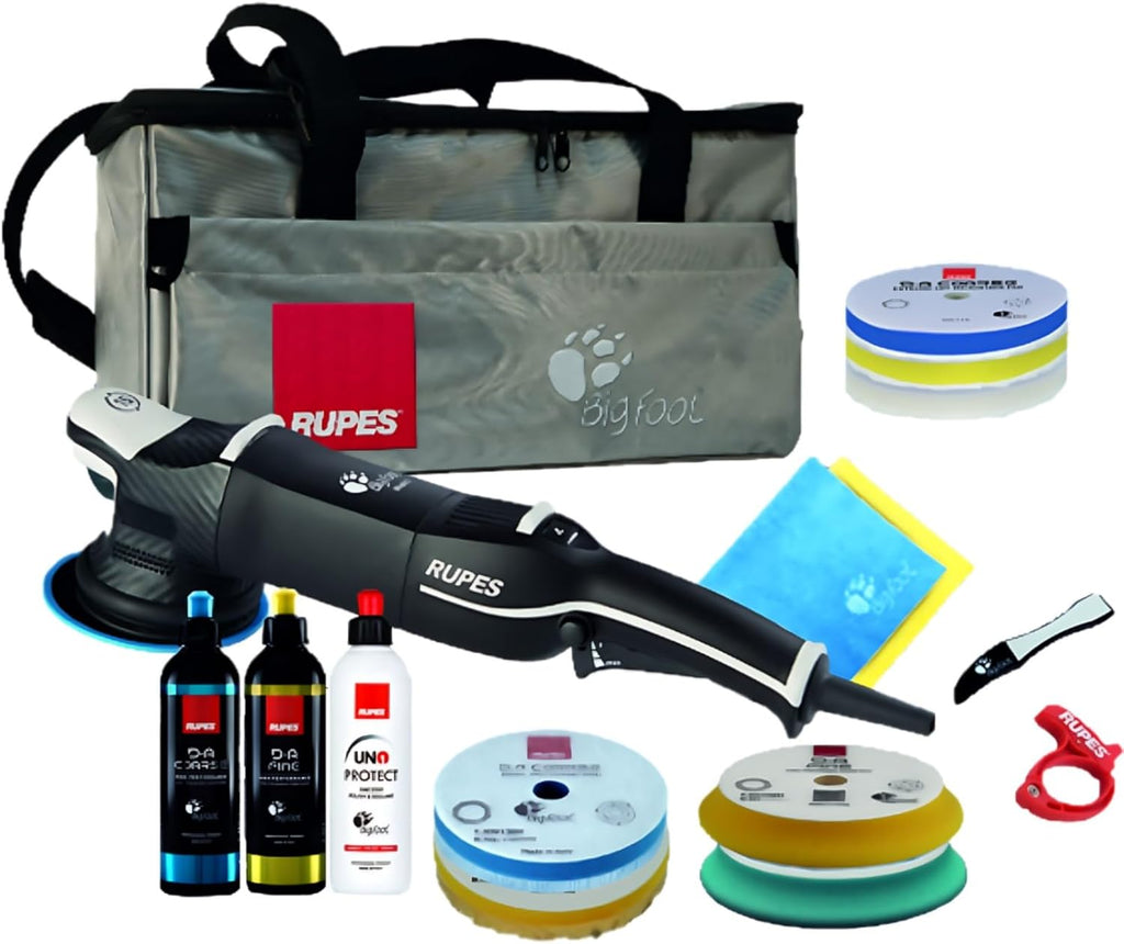 Kit Includes (1) LHR15V Polisher, (1) 980.710/c 125mm/5in Precision Pro backing plate, (1)9.DACOARSE250 250ml coarse compound, (1)9.DAFINE250 250ml fine compound, (1)9.PURE250 250ml ultrafine polish, (1)9.DA150H coarse blue foam pad, (1)9.DA150M fine yellow foam pad, (1) 9.DA150S ultrafine white foam pad, (1) 9.NW130H coarse DA wool pad, (1) 9.NW130M medium DA wool pad, (1) 9.BF9050 blue microfiber towel, (1) 9.BF9060 yellow microfiber towel, (1) 9.BF9070 microfiber towel, (1) 9.BF7001 Claw Pad Tool, (1) 9.Z1024 Cable Clamp, (1) 9.Z868 detailing apron, (1)Semi-rigid BigFoot carrying bag